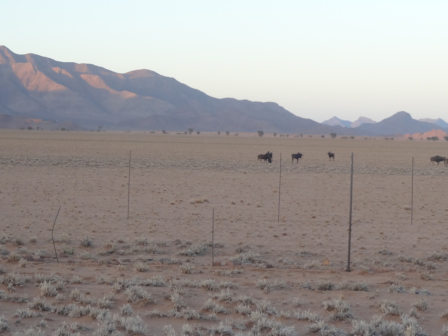 Der Flug nach Windhoek findet täglich nachts (10 Std, Flugzeit) statt. Wir starten 20 Uhr in Frankfurt und landen 7 Uhr Ortszeit in Namibias Hauptstadt. Hier empfängt uns der Sommer mit 28°C! Wir werden von unserer Reiseleiterin „Lilly“ (sie begleitet uns auf der gesamten Reise) empfangen. Die Rundfahrt beginnt sofort mit einer 4-stündigen Busfahrt zum heutigen Tagesziel der „Bitterwater Lodge“. Hier kurz Koffer auspacken, Kaffeetrinken und 17:30 Uhr beginnt die 2,5-stündige Jeep Fahrt durch die Wüste „Kalahari“. Wir entdecken Zebras, Springböcke, Gnus. Orix. Aber leider waren alle sehr entfernt. Nach einem kleinen Picknick mit Sekt und Häppchen sind wir 20:30 Uhr zum Abendessen zurück. Es folgte eine Folkloregruppe mit afrikanischen Tänzen und Gesängen. 22 Uhr fallen wir todmüde ins Bett, immerhin sind wir seit 39 Stunden auf den Beinen.