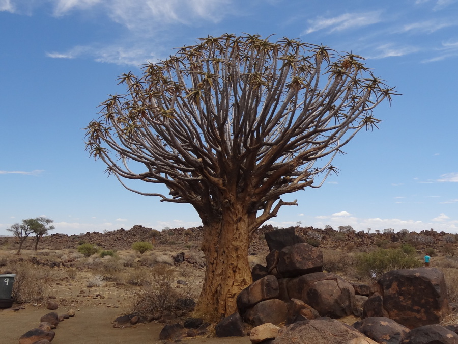 Unterwegs „Pampa“ soweit das Auge reicht. Flache Savanne mit kleinen vertrockneten (es hat 4 Jahre nicht richtig geregnet!) Büschen. Tiere sehen wir nicht. Kurz vor unserem heutigem Tagesziel ist der „Köcherbaum“ Wald. Diese bizarr anzusehenden 9 m hohen Bäume verdanken ihren Namen den Buschmännern. Sie höhlten die Äste aus und stellten Köcher für ihre Pfeile daraus her. Übrigens eine Baumgruppe über 7 Stk. wird in Namibia Wald genannt!