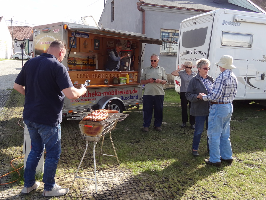 Montag, 15.04. Nachdem wir alle 10 Uhr am vereinbarten Treffpunkt waren, fahren wir (wir fahren im weiteren Verlauf der Reise alle individuell zum Tagesziel) auf guter Straße 82 km zum 1. Campingplatz in Hirschberg. Es erwartet uns ein gut besuchter Platz. Das Wetter ist schon sommerlich warm. Gegen 12 Uhr sind wir da. Da heute gegrillt wird, Matthias hat seinen bekannten Schaschlik angekündigt, trinken wir mittags nur Kaffee mit Kuchen. Pünktlich 15 Uhr geht es los! Wir leeren ein Fass Bier (30 Liter!) und der Schaschlik schmeckt vorzüglich. Alle sind guter Laune, ein gelungener Auftakt unserer gemeinsamen Reise.
