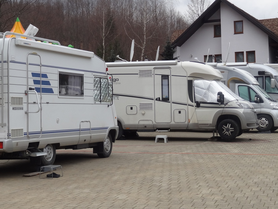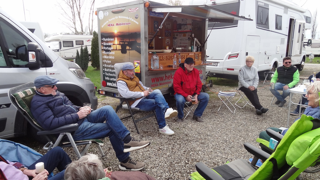 Früh laufen wir zum Schlamm-Vulkan. Es brodelt und blubbert. Eine graue Brühe! Später gehen wir zu Penny einkaufen. Ein riesiger Markt mit Allem! Viele Leute, denn das Osterwochenende steht bevor. Es wird hier eine Woche später gefeiert als bei uns. Die Fahrt geht auf guter Straße (komische Fahrspuren eine normale, eine halbe ganz rechts) Wir sind froh, als wir den Platz erreichen. Eine Caravanwerkstatt mit kleinem Campingplatz aber alles vorhanden. Wir sind die Ersten. Ich fange schon mal an das sehr, sehr dreckige Womo zu waschen. Im Spätnachmittag treffen wir uns bei Matthias am Bierwagen.